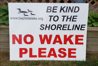 June 2021 – FOCA member group, the Baptiste Lake Association has created their own sign (pictured at the side) to encourage good wake etiquette on their lake! This picture was copied from Facebook, where they posted about their sign project.